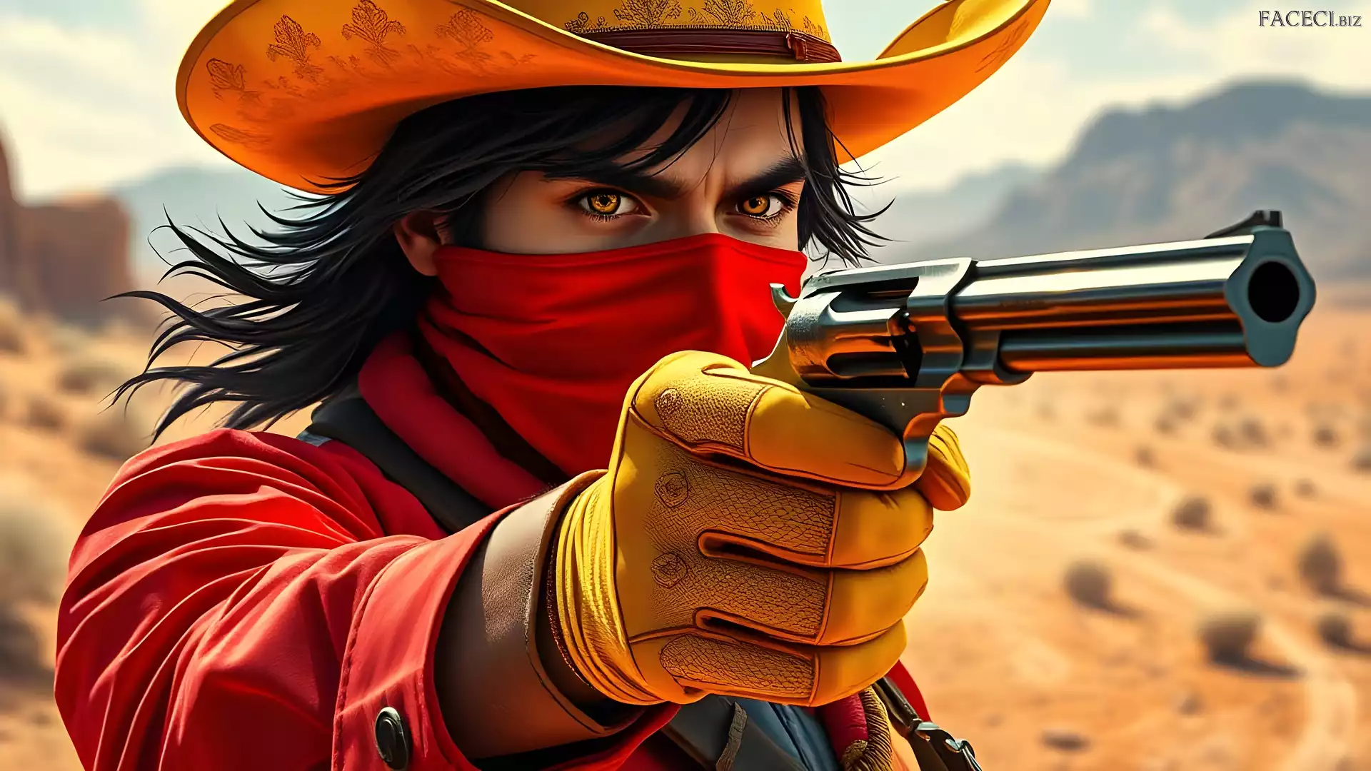 Grafika, Kapelusz, Mężczyzna, Maska, Pistolet, Rękawice - faceci.biz